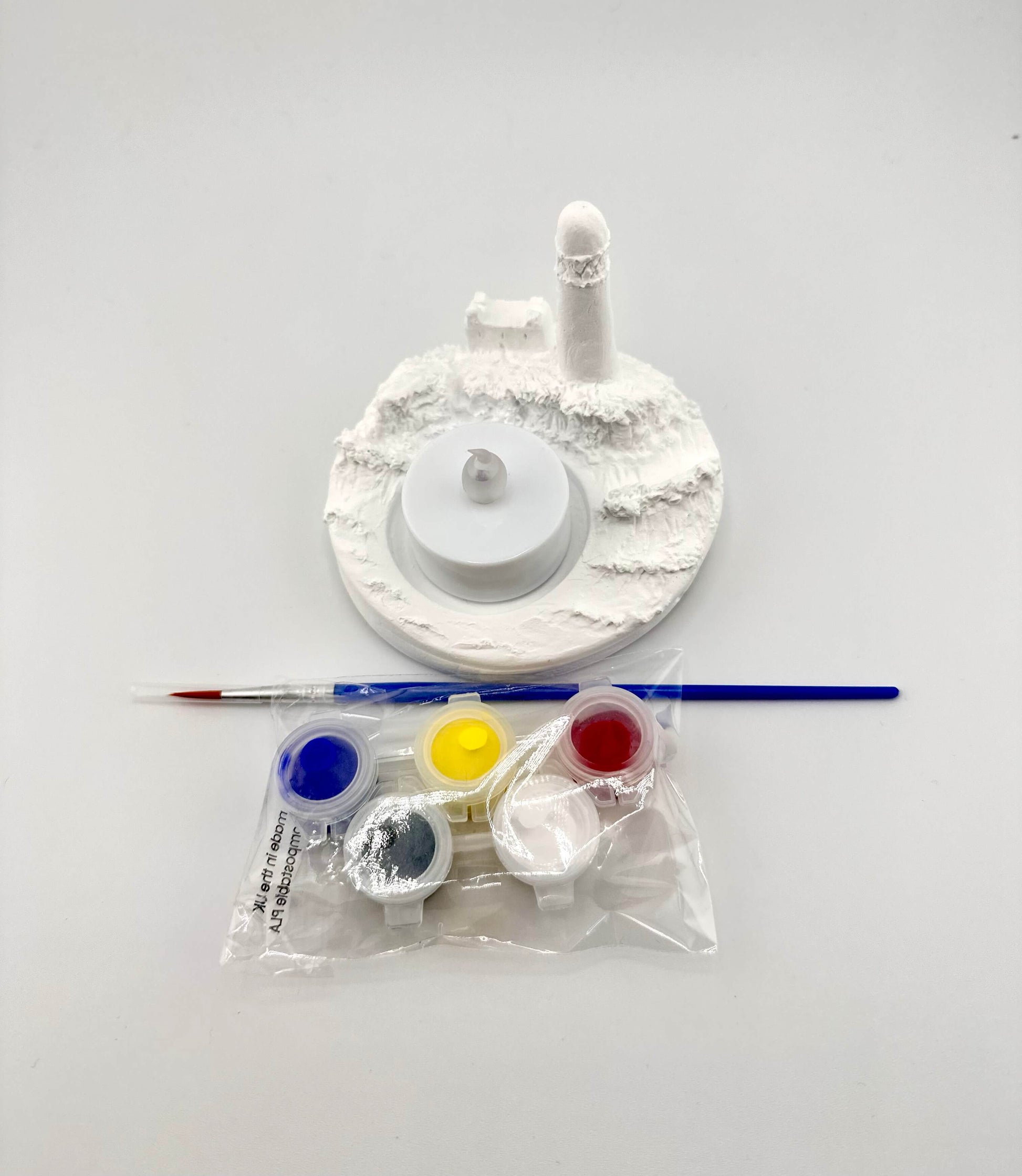 A paint your own lighthouse tealight holder sculpture inspired by Scottish Stevenson lighthouses with craggy cliffs and rough seas. Includes a flameless tealight and optional acrylic paint set. Sculpted by Becky Stout.
