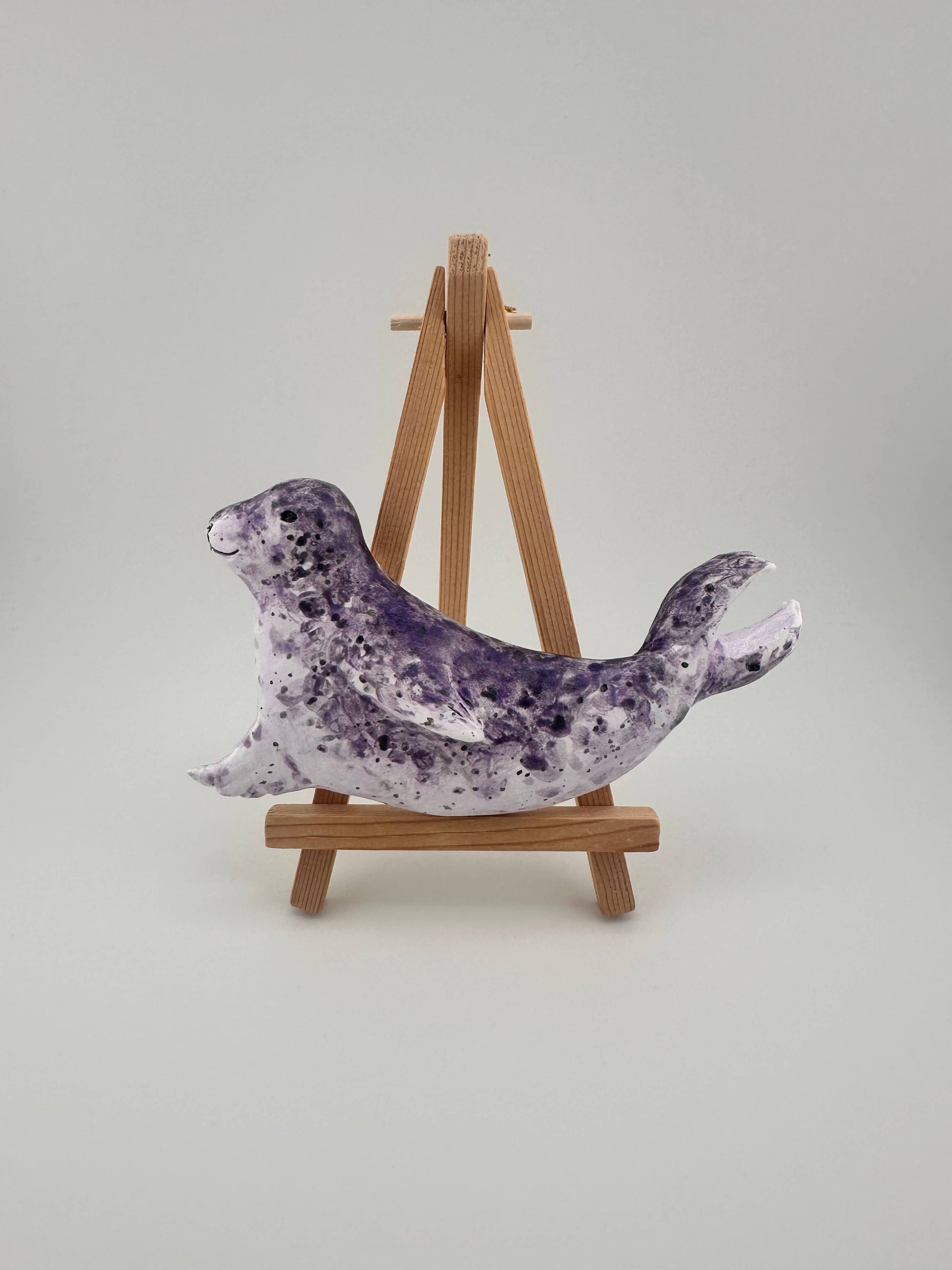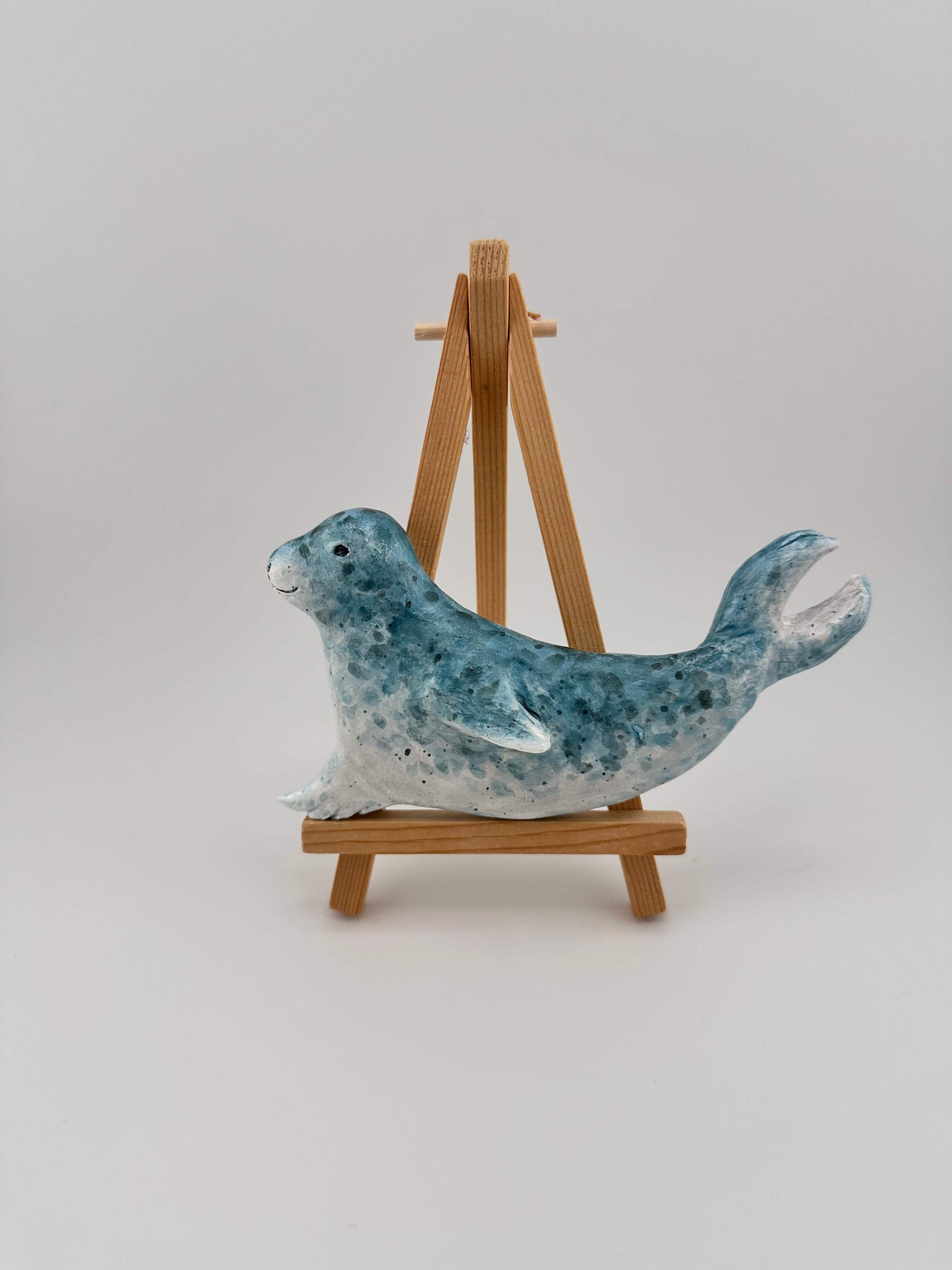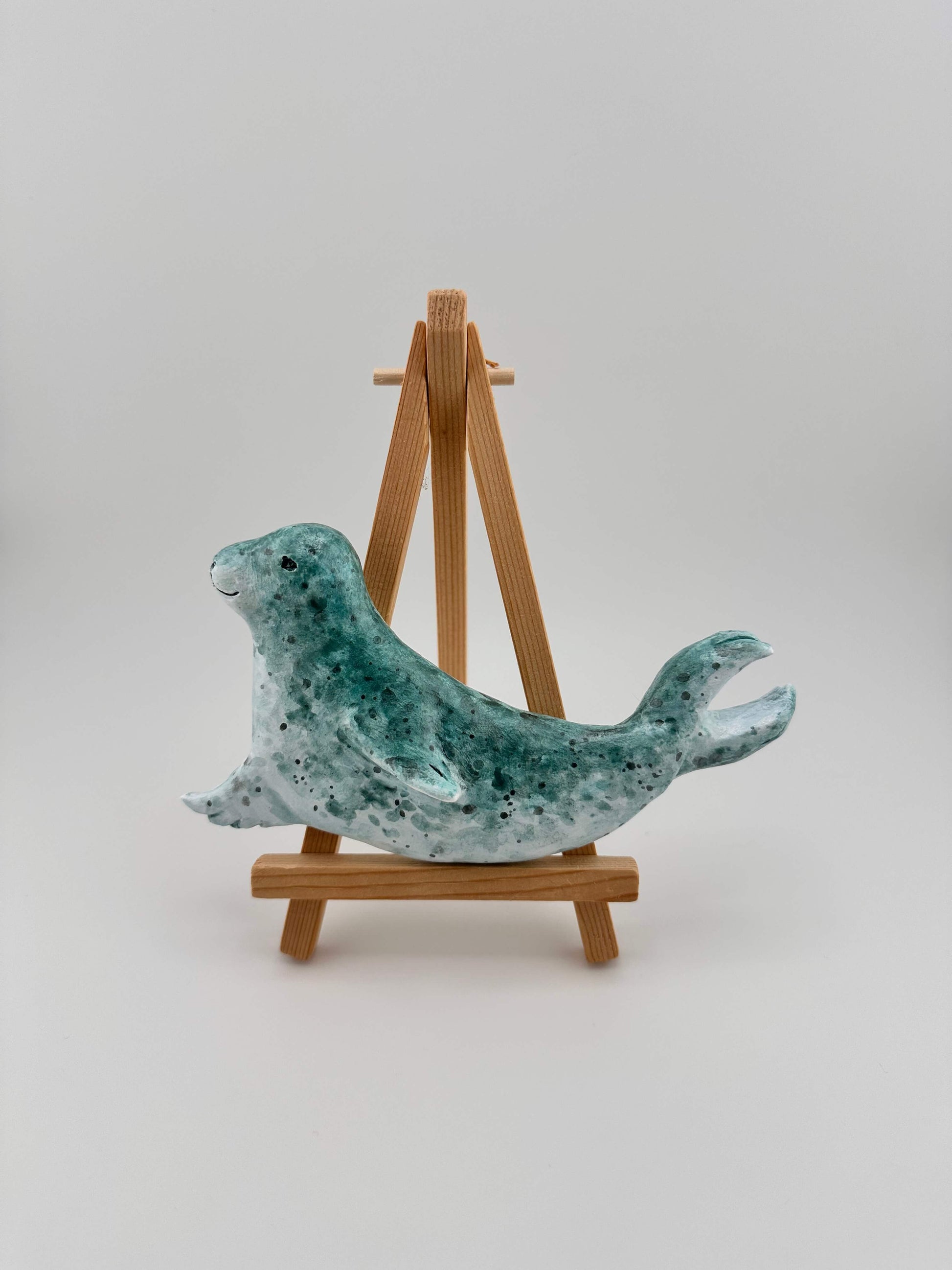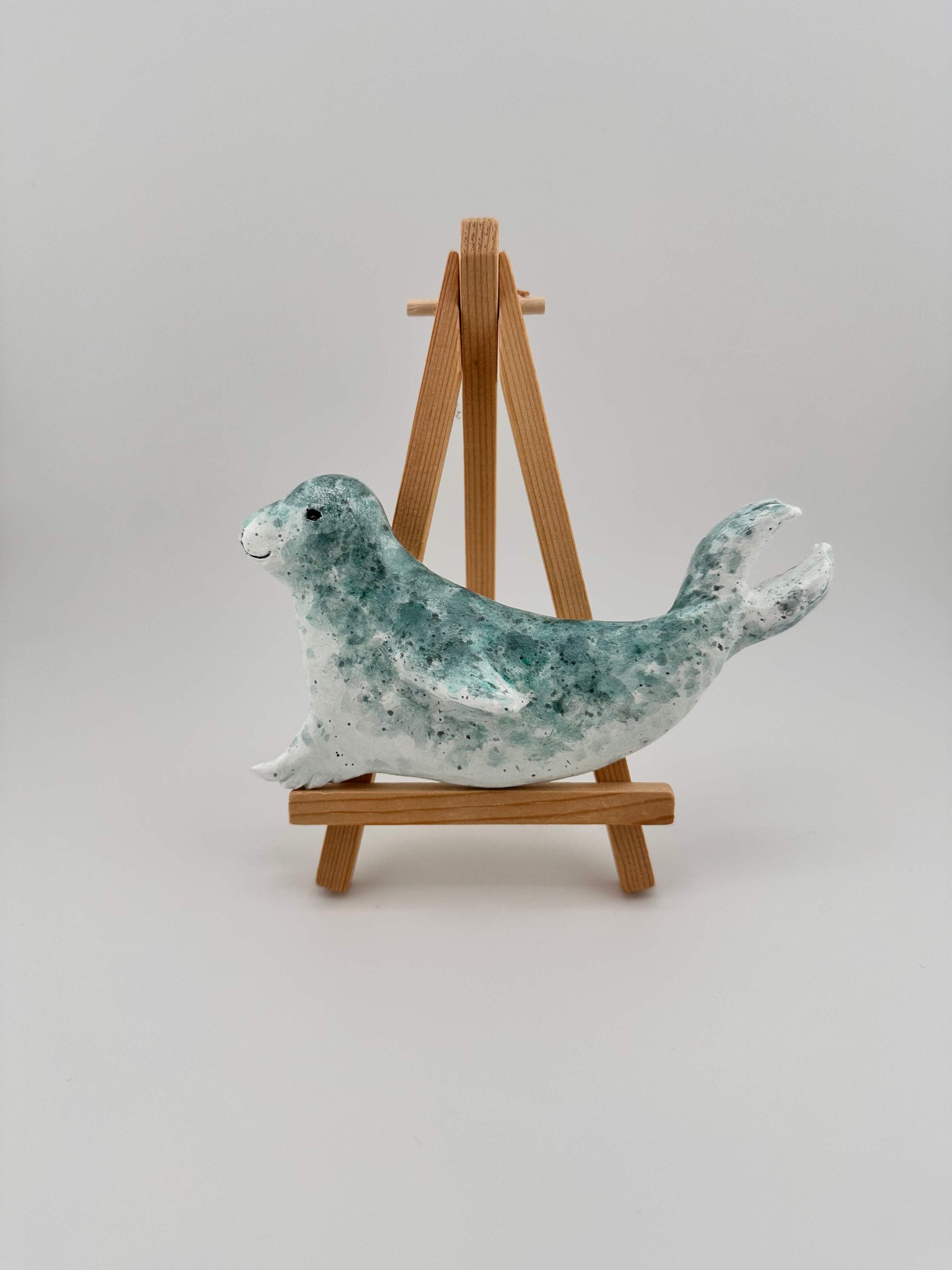 A cute ceramic seal. This little guy is hand painted with mica paint to capture the pearlescent shimmer of light on wet fur.